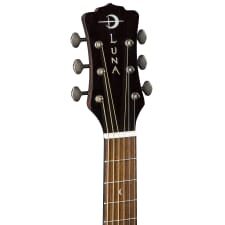 Musicians we get it Youre always on the go! On your next voyage, make sure to pack the Safari Art Vintage Travel Guitar! Expanding on the popular Vintage Series, Luna added a dreadnought sized travel guitar to offer guitar players a journey-friendly option. Carefully handcrafted with eastern mahogany back and sides and a spruce top, the Safari Art Vintage marries quality and practicality with a rustic vintage design. Attention to detail is not slim; the Safari Art Vintage showcases multiply cream bindingaround a distressed finished body, youll also notice a simple yet elegant rosette designaround the sound hole. From the brushed nickel open gear tuners to the vintage satin finish and the signature moon phase inlays, this safari acoustic guitar is the ideal travel companion. Songwriters and musicians take time to write music and deserve a reliable guitar to takealong the way. Gigbag included. Join the Luna Tribe!