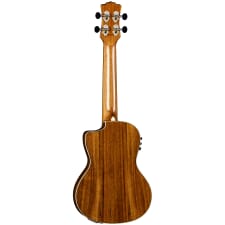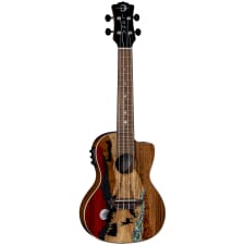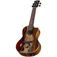 The Vista Series blends the world of fine art together with the art of advanced instrument building. Each Vista uke features an aesthetically pleasing portrait of wildlife, illustrated by using a variety of tropical woods. The Vista Deer Concert Ukulele, handmade from a combination that includes Padauk, Mother of Pearl, Blackwood, Spalted Maple, Teal Abalone, Quilted Mahogany, and Koa, is a unique work of art. Precision fitted with a hand-shaped 15 scale mahogany neck and pearloid moon phase inlaid black walnut fretboard, the Vista Deer ukulele’s feel, playability, and stand-alone acoustic sound are nothing short of inspirational. The Vista Deer features a gloss finished, maple binding, concert body with Koa back and sides for enhanced tone and projection. Enjoy premium amplification from the Fishman Kula preamp with onboard tuner. Padded gigbag included. Join the Tribe!